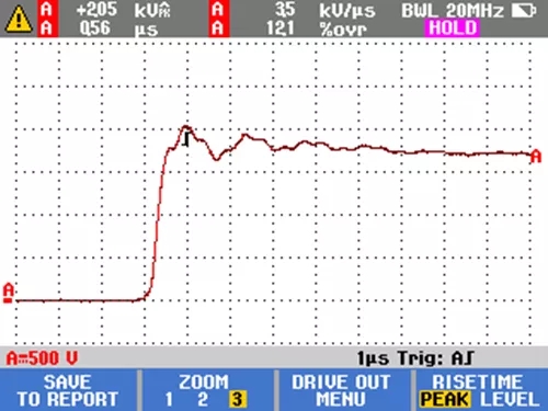 電機(jī)輸入端電壓上升沿波形,存在過沖電壓!